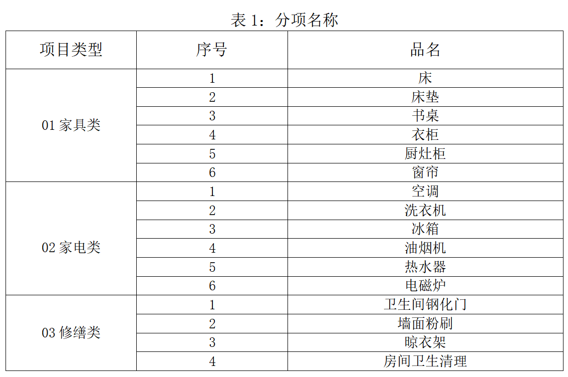 (3)家具类控制价:3200元/间,家电类控制价:4800元/间,修缮类控制价:2500元/间。