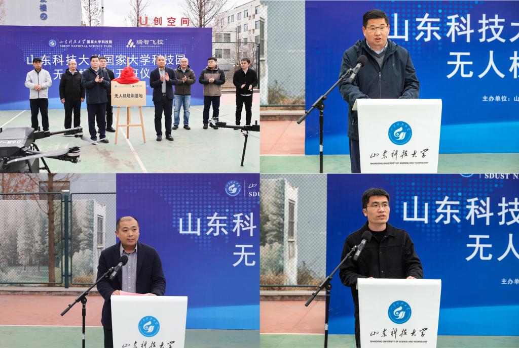 仪式上,校企双方代表分别致辞。任国贞副总经理表达了企业对深度参与校企协同育人的高度重视与期待。薛力处长阐述了此次合作是学校培育新质生产力、国家大学科技园抢抓低空经济市场机遇,构建“教育-培训-产业”闭环生态的关键举措。李振海副院长则表示,学院将全力推动专业教学与技能培训的深度融合,为人才培养提供坚实学科支撑。随后,任国贞与薛力共同为“山东科技大学国家大学科技园无人机培训基地”揭牌。